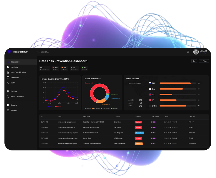 HexaFort DLP is a comprehensive data protection platform designed to prevent data breaches, detect insider threats, and accelerate incident investigations. Whether you need to secure intellectual property, meet compliance requirements, or gain deeper insight into user activity, our solution gives you the tools to act with confidence.